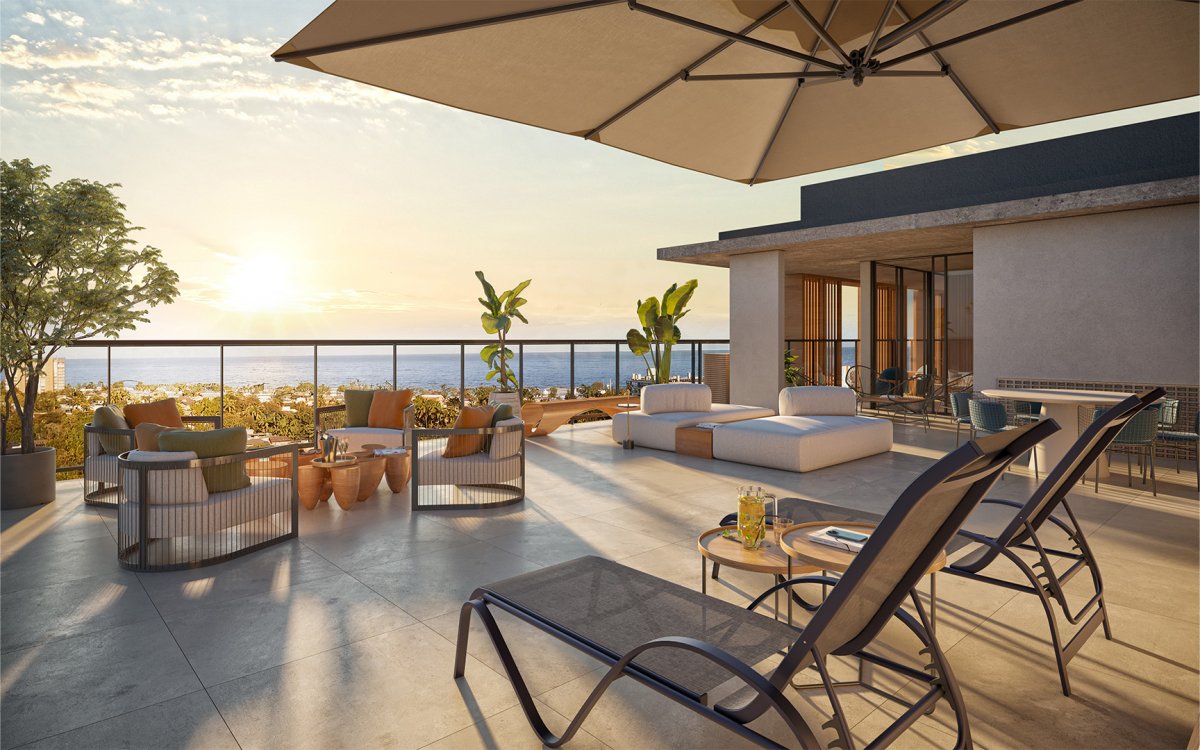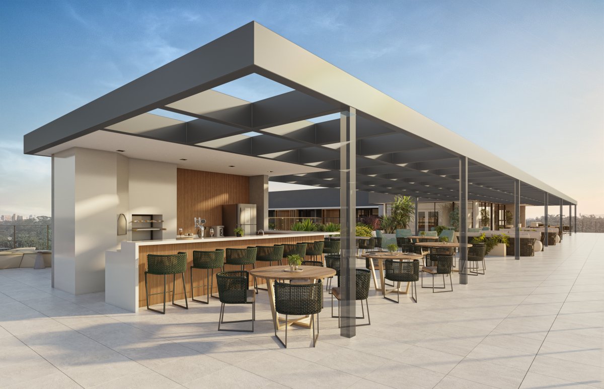 Piscina com borda infinita e solarium, bar do rooftop e gourmet na cobertura.