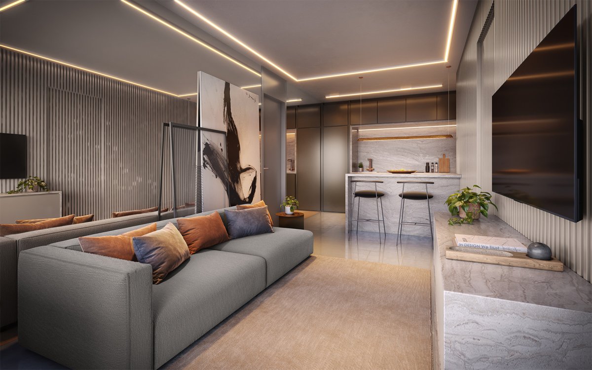 Perspectiva do living do apartamento de 116 m² com 3 dorms. (2 suítes)