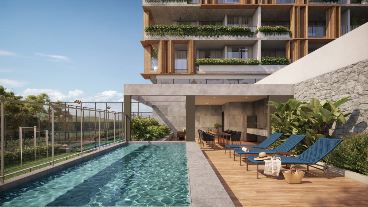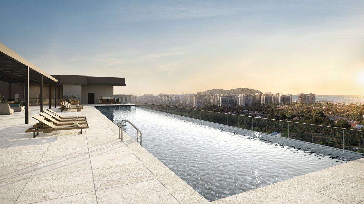 Piscina com borda infinita e solarium, bar do rooftop e gourmet na cobertura.