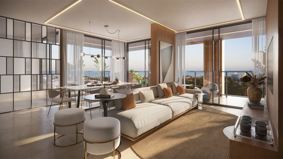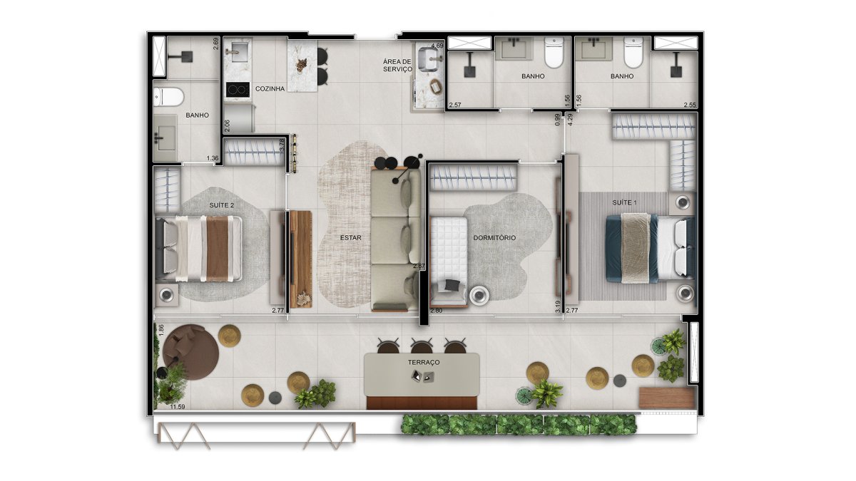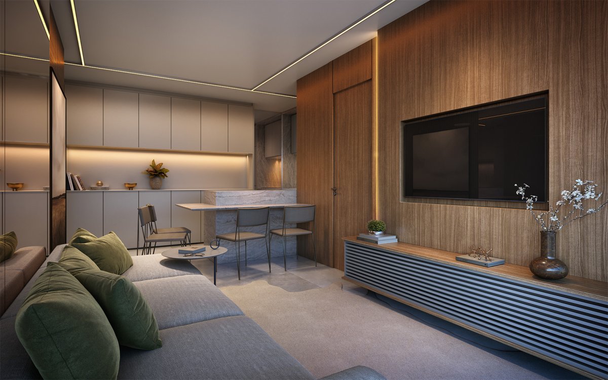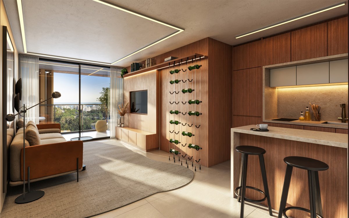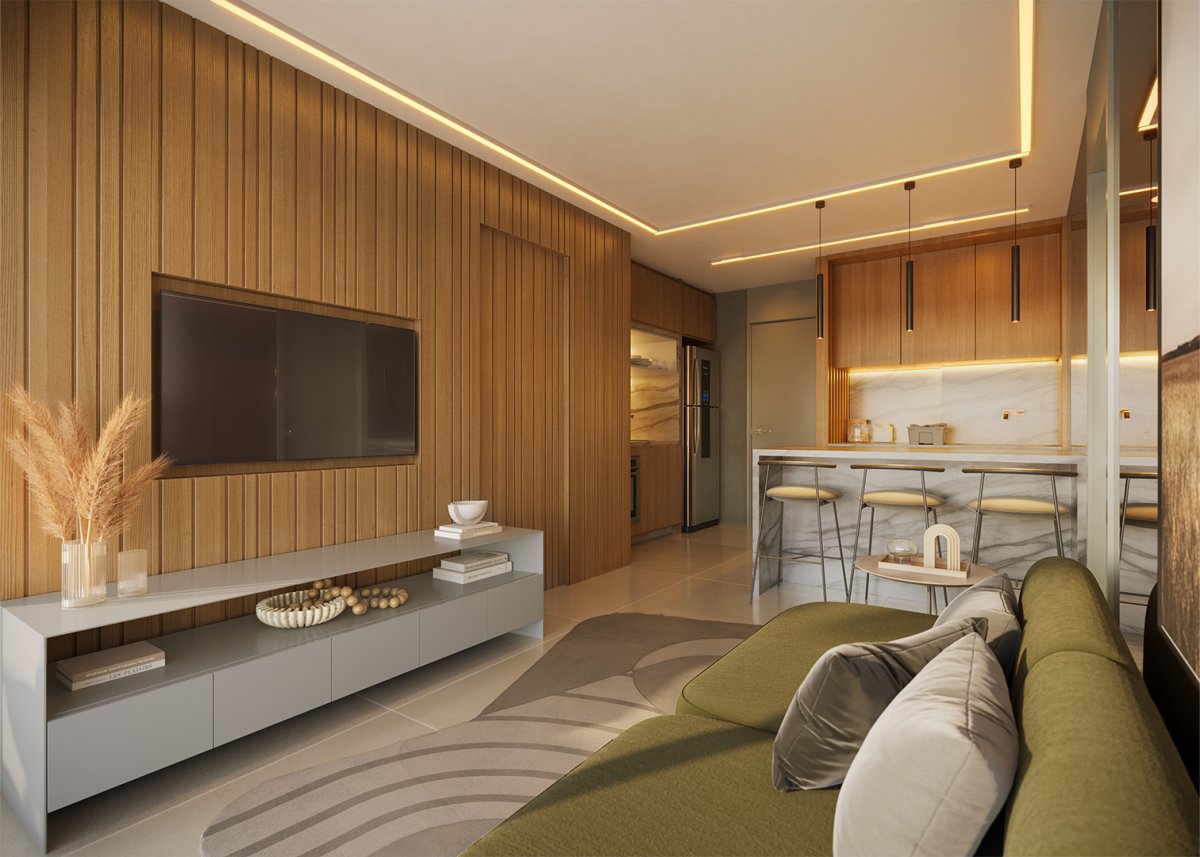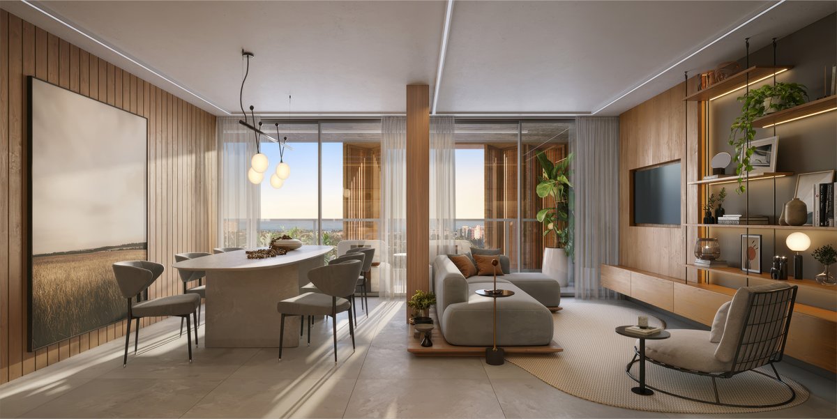 Perspectiva do living do apartamento de 116 m² com 3 dorms. (2 suítes)